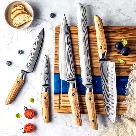 Messer-Set 5tlg.Damast Kochmesserset 67 Schichten Damaszenerstahl mit Oliven Holz Griff